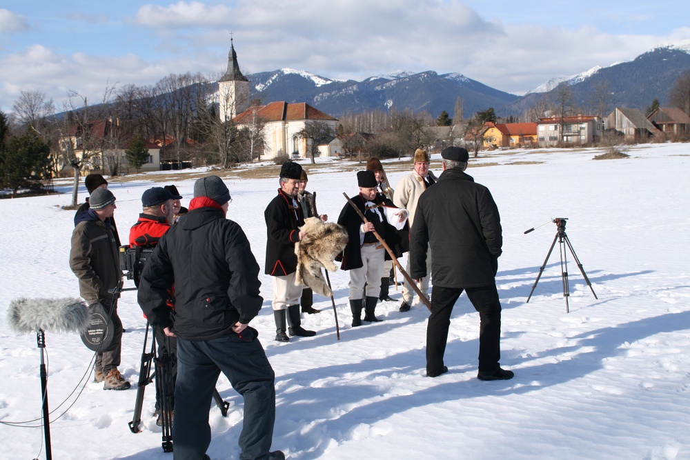 1-2. marca do našej dediny zavítal štáb STV, aby natočil videoklip do folklórnej hitparády Kapura. Téma bola lapanie vlkov do sieťí v Smrečanoch. Hoci počasie bolo skôr jarné, pozostatky snehu ešte stačili na navodenie zimnej atmosféry. Štáb bol aj celkom milo prekvapený z prostredia a blízkeho okolia našej obce. Celú scénu sme sa snažili urobiť tak, aby sa to čo najviac podobalo skutočnosti. Zhruba 5 minútový klip sme robili 2dni.V piatok sme nahrávali spevy, ktoré sme v sobotu už spievali pri filmovaní na plejbek. Samotné nahrávanie je celkom zaujímavá vec. Nahrávali sme v KD najprv na javisku , ale to nevyhovovalo z hľadiska akustiky-robila sa ozvena a tak sme prešli do zasadačky, kde to bolo o niečo lepšie. Pri nahrávaní bola dôležitá disciplína, absolútne ticho v miestnosti, ale aj v okolí. Citlivé mikrofóny zaznamenali každý rušivý element, každú chybičku, zašuchotanie papierom, poklopanie nohou, jemné zahmkanie, atď .Takže nahrávky sa niekoľko- krát museli opakovať. Robili sme ich vyše dvoch hodín. V sobotu sa filmovalo v obci a jej blízkom okolí. Niekoľko perličiek z filmovania: pri scéne pred kostolom sme museli čakať kým prejde lietadlo , ktoré bolo počuť a ďalších 15 minút kým sa stratí dymová čiara z leteckých motorov nad kostolnou vežou. Alebo pri scéne s vlkom začalo zvoniť a zvonilo celkom dlho. Ďalej nás zdržiavala ringopíla, ktorou ktosi pílil drevo, alebo traktorček, ktorí šiel po hôrkach. Najnáročnejšie scény boli u richtára, kde v jednom kuse bolo počuť autá z hlavnej cesty .A tak sa scéna točila stále znova, alebo sme sa ju pokúsili rýchlo natočiť, kým bolo ticho . Celé sme to stihli len tak tak , lebo slnce už bolo pomerne nízko a už sme sa dostávali do tieňa. Celé popoludňajšie točenie bolo pomerne náročné. Poďakovať by sme chceli rodine J. Stromku a P. Šiarnika za občerstvenie .Celá táto akcia mala svoj význam. Pre našu folklórnu skupinu to bola nová skúsenosť. Snáď sa nám podarilo spropagovať našu obec a jej jedinečné zákutia. Chceli by sme ukázať Slovensku prostredníctvom vysielania Kapury naše jedinečné zvyky z lapania vlkov. A ak sa vám to bude páčiť, hlasujte …...